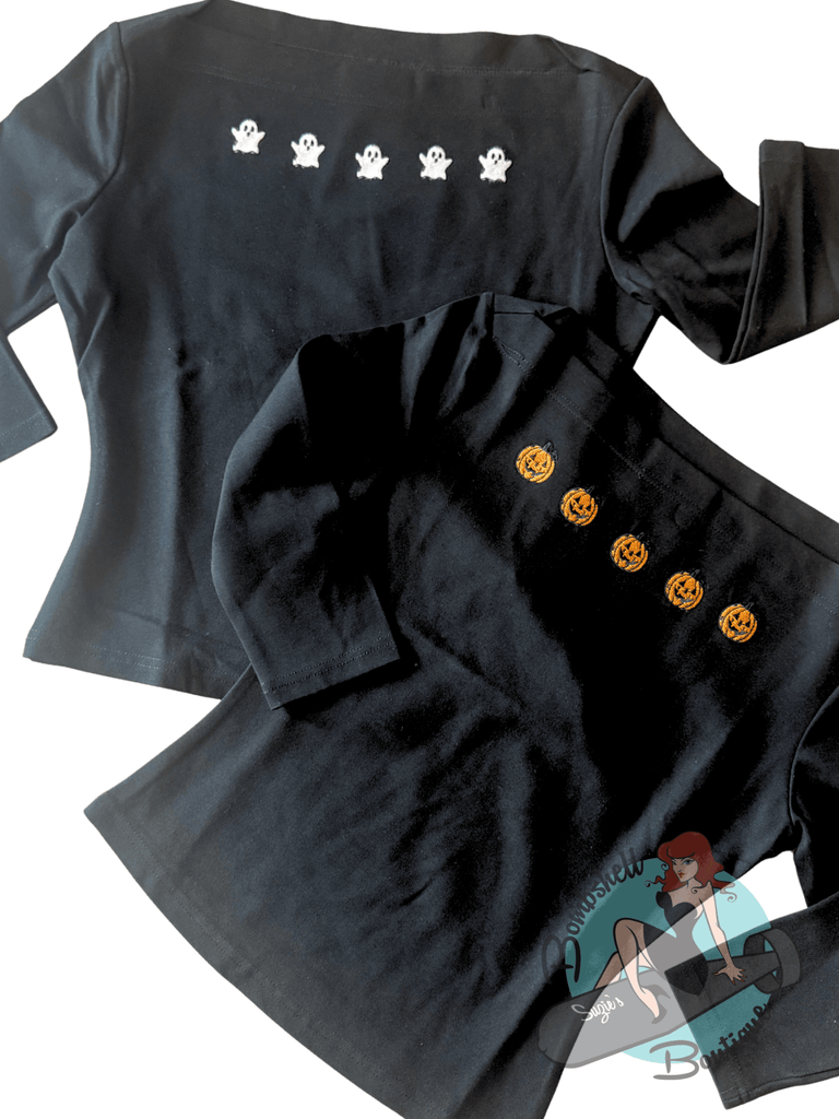 Add some spooky cuteness to your pin-up wardrobe with the Spooky Audrey Boatneck Top. Your favourite pinup essentials top is now available with custom embroidered Jack-o-lantern or Ghost embellishments. Take your everyday pinup look into the Halloween season with this spooky twist on our popular, classic bateau neck top. Top off your vintage gal look with the matching Bombshell Spooky Beret!