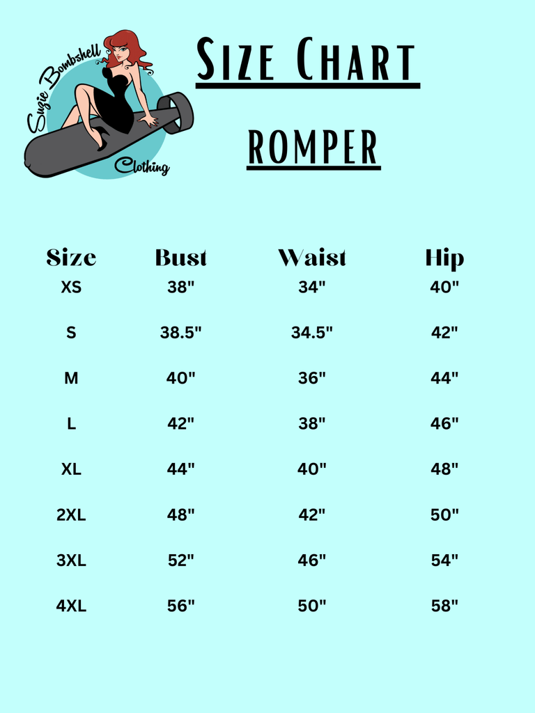 Size Advice: Please note, due to the elasticated panels, the bodice of romper has approximately 1-2" stretch. Review the attached Romper specific Size Chart. We are happy to offer personalized fit advice via email: suziesbombshellboutique@gmail.com